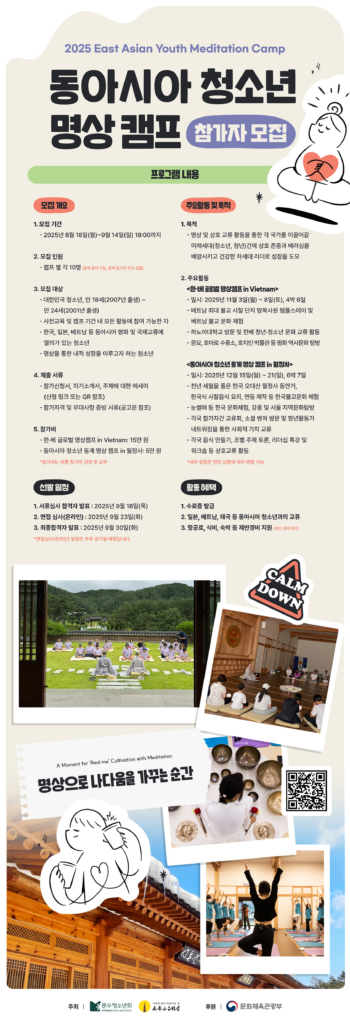 2025 한·베 글로벌 명상 캠프 및 동아시아 청소년 동계 명상 캠프 한국대표단 참가자 모집(~9/14) (사)문수청소년회는 청소년들의 건강한 인성과 조화로운 성장을